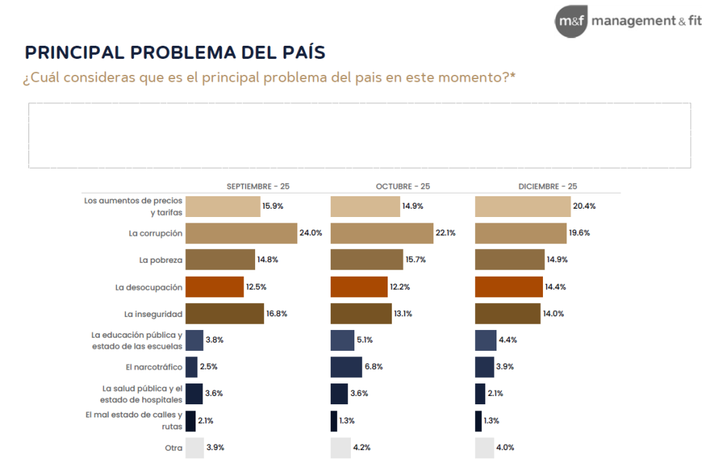 De esta manera, durante los 2025 nuevos temas alcanzaron picos históricos. La inseguridad alcanzó un 26% de las menciones durante el mes de marzo de 2025. Mientras que, la preocupación por la corrupción encontró su pico en el mes de septiembre alcanzando un 24%. De esta manera, durante algunos meses del año, la corrupción superó a la inflación.